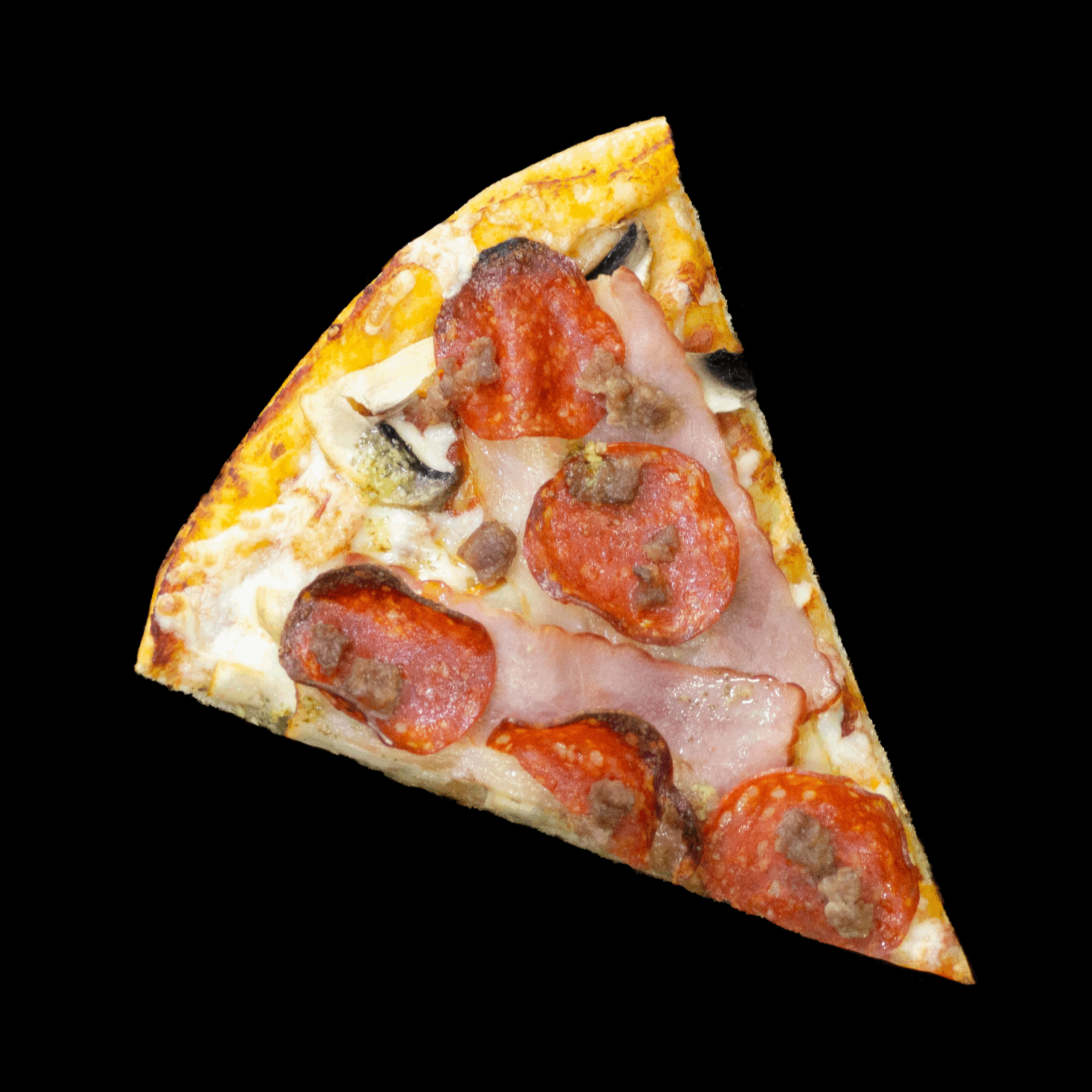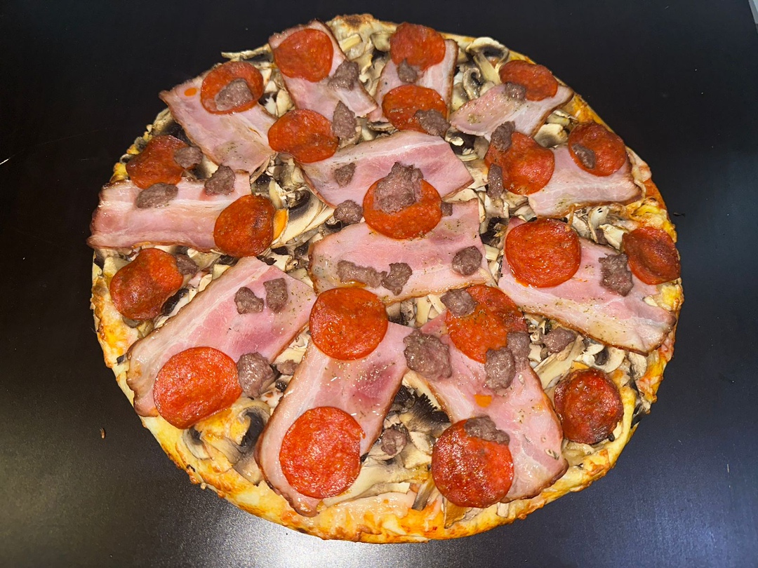 Состав: сыр, томатный соус, шампиньоны, бекон, пепперони, фарш говяжий, чесночное масло.
