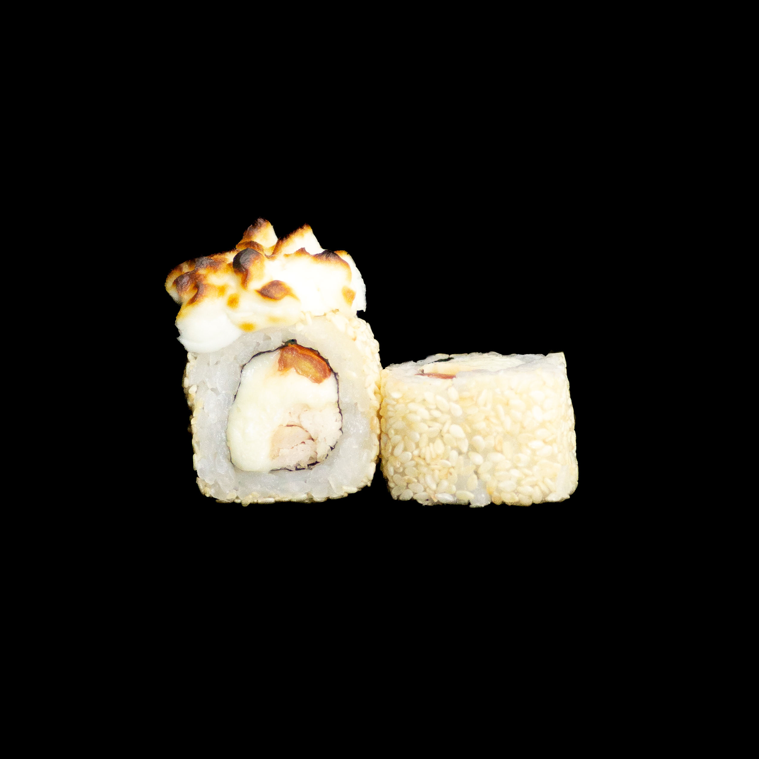 В основе — нори и нежный рис, дополненные тянущимся сыром моцарелла, сочной курицей и спелым помидором. Посыпка из кунжута придаёт лёгкий ореховый оттенок, а сверху ролл украшен воздушной шапкой из сыра Cremetta и полит унаги-соусом. Такой ролл сочетает в себе мягкость, свежесть и аппетитную пикантность.