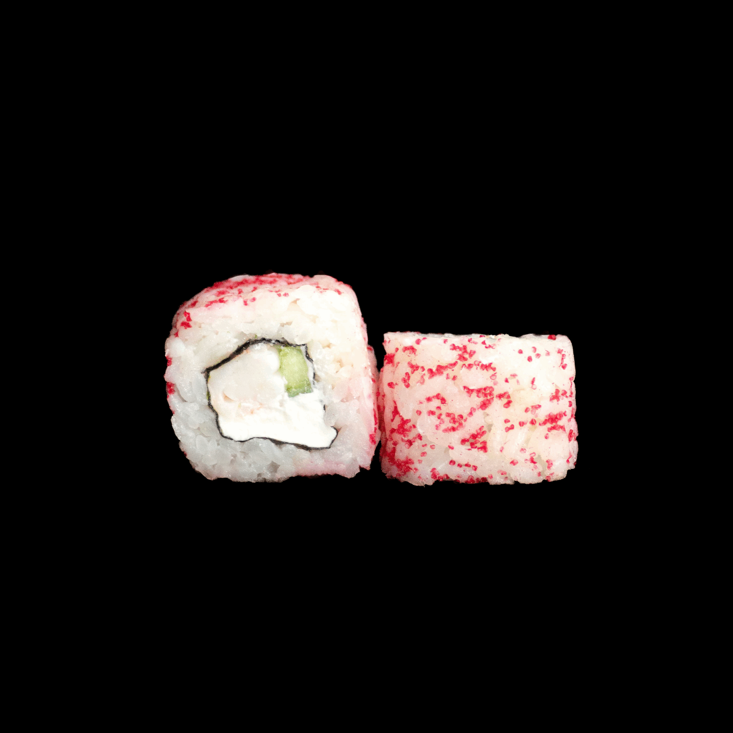 Ролл «Калифорния Эби» — нежное сочетание с морским акцентом. В основе — нори и нежный рис, дополненные сливочным сыром, свежим огурцом и сочной креветкой. Сверху ролл покрыт икрой тобика, которая добавляет лёгкую хрустящую текстуру и насыщенный вкус моря. Лёгкий, аппетитный и гармоничный ролл, который понравится любителям морепродуктов.