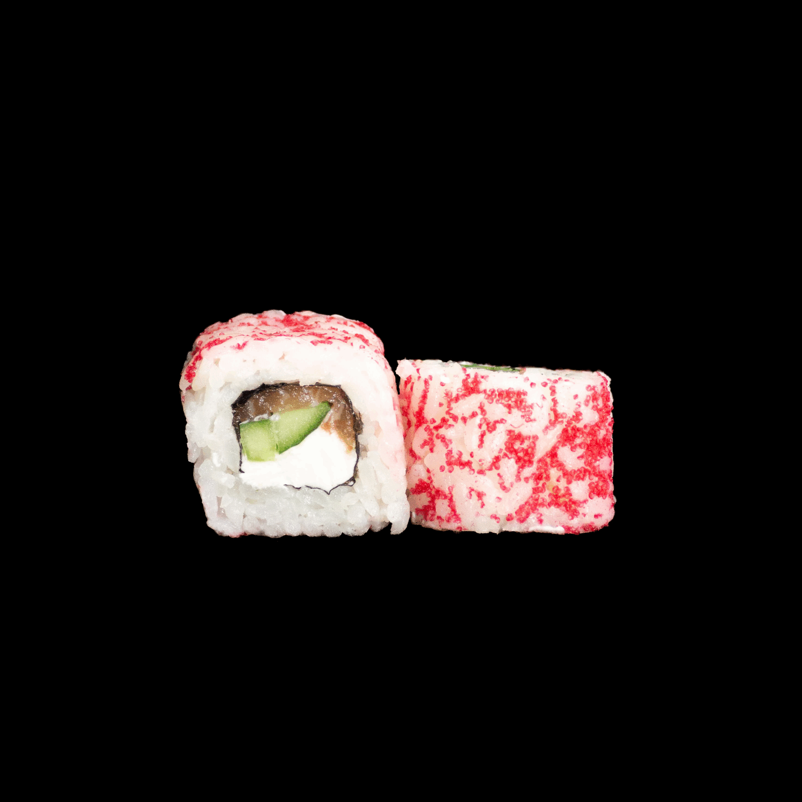 Ролл «Калифорния Лосось» — классика с изысканным акцентом. В основе — нори и нежный рис, дополненные сливочным сыром, свежим огурцом и деликатным лососем. Сверху ролл покрыт икрой тобика, которая придаёт аппетитную текстуру и лёгкий морской вкус. Сбалансированное и популярное сочетание, которое стало настоящей визитной карточкой японской кухни.