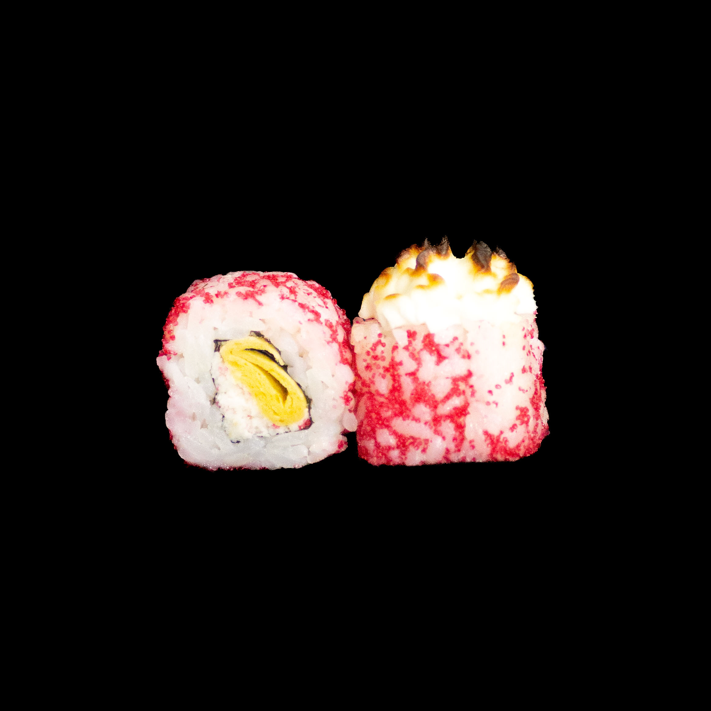 Ролл «Огонь» — яркий и насыщенный вкус с пикантным акцентом. В основе — нори и нежный рис, дополненные краб-кремом, сливочным сыром и воздушным омлетом. Икра тобика придаёт лёгкий морской оттенок и хрустящую текстуру, а сверху ролл украшен аппетитной сырной шапкой, которая делает вкус более сливочным и сытным. Отличный выбор для любителей насыщенных роллов.