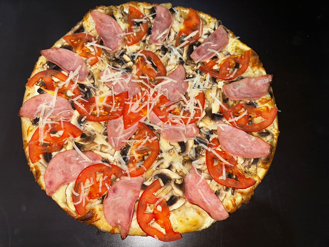 Пицца «Регина» — королевское сочетание вкусов. На нежном тесте — сочные ломтики ветчины, ароматные шампиньоны и спелые помидоры. Всё это покрыто расплавленным сыром и дополнено майонезом для сочности. Завершающий штрих — тёртый пармезан, придающий пицце особую насыщенность и благородный вкус. Отличный выбор для ценителей классики.