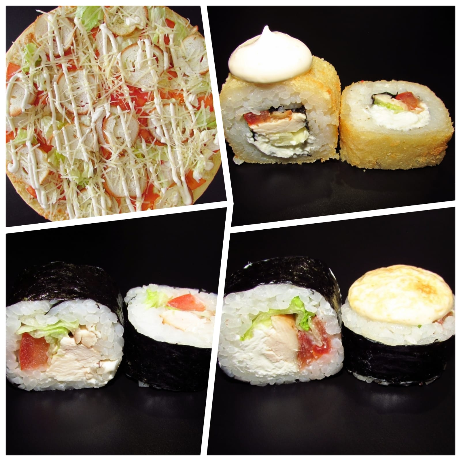 Пицца Цезарь + Жареный Цезарь + Запечённый Цезарь + Цезарь ролл + соус, васаби и имбирь.