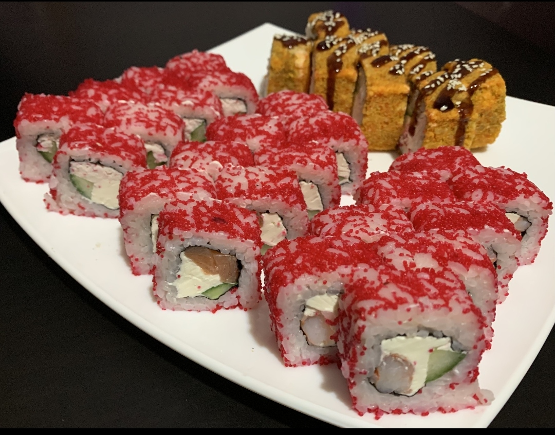 Калифорния Лосось — ролл с лососем, огурцом, сыром и икрой тобика.
