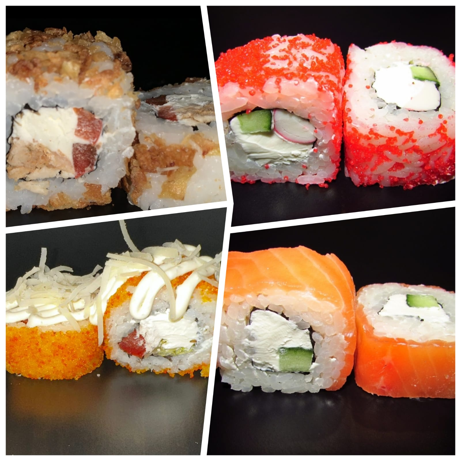 Филадельфия Супер Лайт + Калифорния Краб + Хруст + Жареный Цезарь (чесночный, пармезан) + соус, васаби и имбирь.