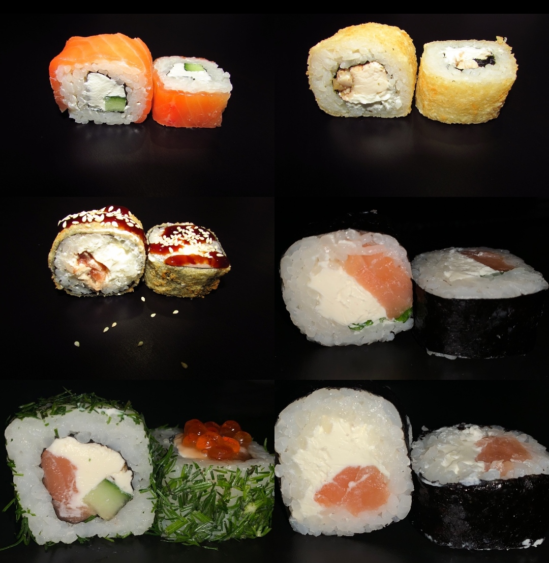 Филадельфия Супер Лайт + Укропный + Филадельфия Фитнес + Филадельфия Супер Фитнес + Филадельфия Темпура + Азалия + соус, васаби и имбирь.