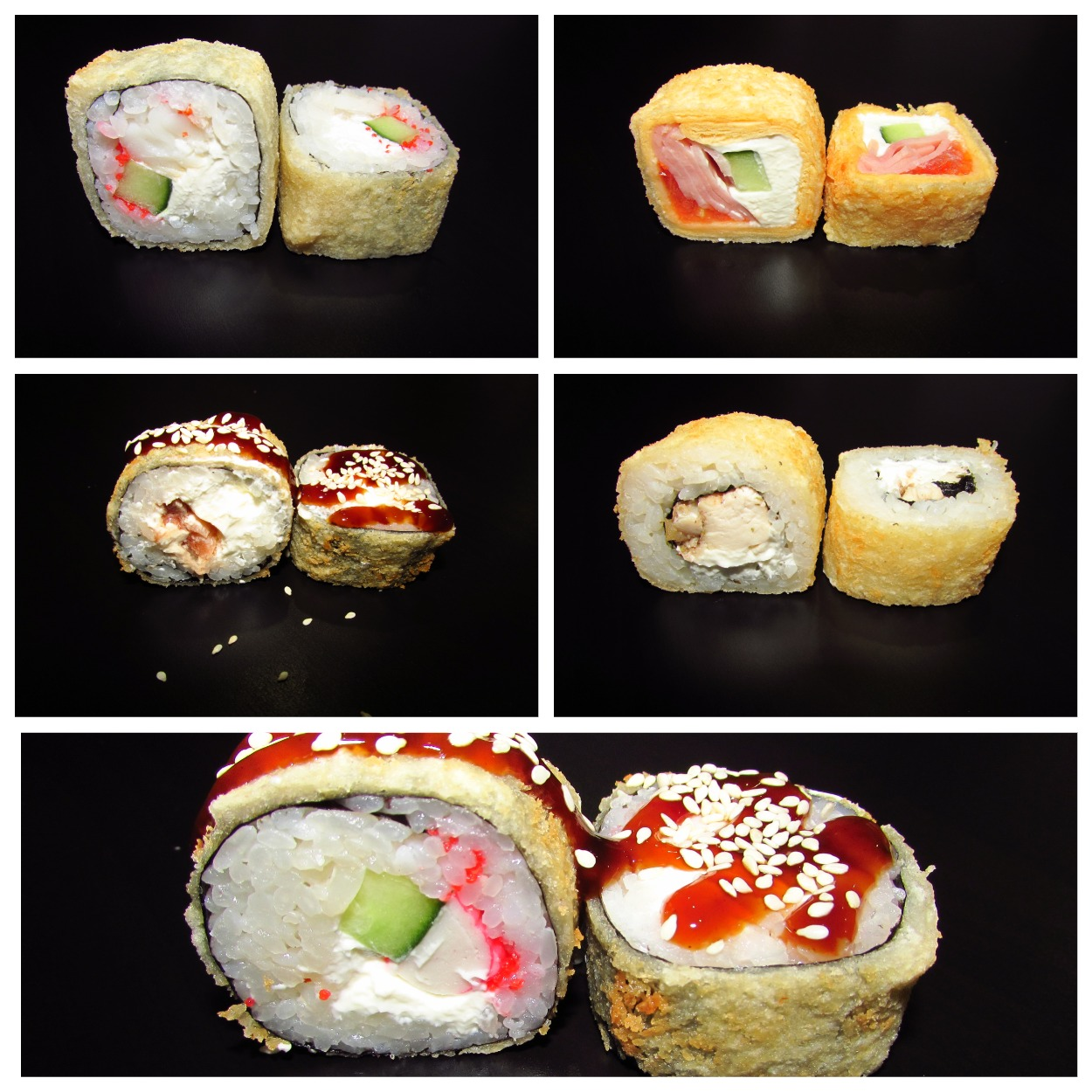 Азалия + Эби Темпура + Тортилия с ветчиной + Калифорния Темпура + Филадельфия Темпура + соус, васаби и имбирь.